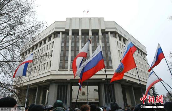 當地時間2014年2月27日,烏克蘭辛菲羅波爾,克里米亞議會大樓上升起俄羅斯國旗。
