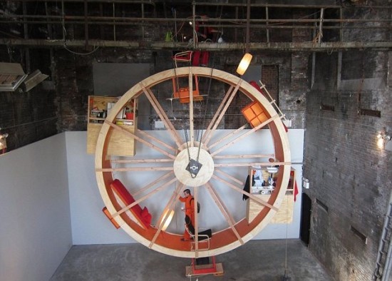 這個(gè)巨型滾輪上設(shè)有床、廚房、浴室等,因此兩人無論是吃飯、洗澡、睡覺,都不離開滾輪。