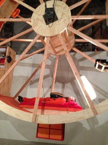 圖為藝術(shù)家在滾輪中睡覺。