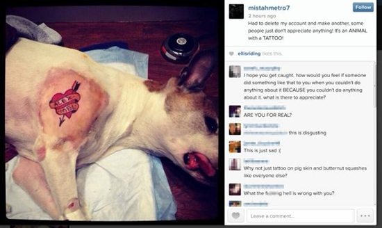 據外媒報道,近日美國紐約一名網名為“MistahMetro”紋身藝術家給自己的狗紋身后,將照片炫耀式地傳至網絡,引來大批網友的批評。