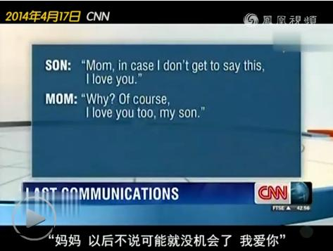 記者:我給大家分享一些船內(nèi)乘客發(fā)送的短信,這些發(fā)給他們的朋友家人的短信不斷出現(xiàn),可以料想短信內(nèi)容讓人令人心痛。一個(gè)兒子給他媽媽的短信中寫到,“媽媽以后不說(shuō)可能就沒機(jī)會(huì)了,我愛你。”而兒子的媽媽并不知道發(fā)生了什么,她回復(fù)到“為什么突然說(shuō)這個(gè),我也愛你。”很多學(xué)生也向他們的朋友發(fā)送短信,一名學(xué)生向?qū)W校戲劇社團(tuán)發(fā)送了一條短信,他寫到“我感謝我們都要死了”“如果我做錯(cuò)了什么,請(qǐng)?jiān)徫?rdquo;,最后他寫到“我愛大家”。