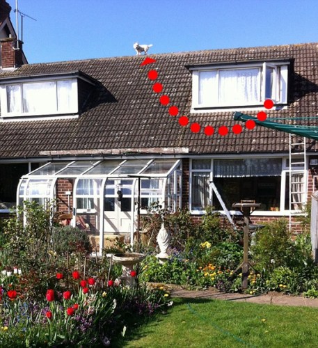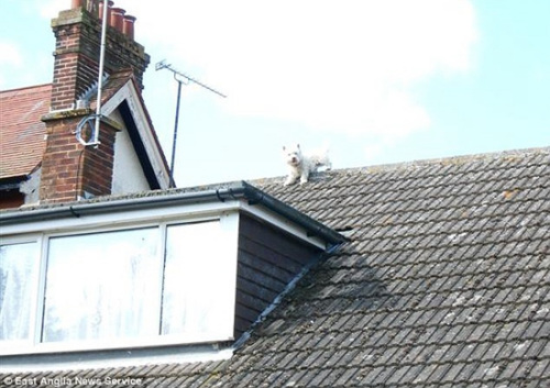事發當天,這只名叫威士忌的小狗被屋外的海鷗叫聲吸引,隨即爬出臥室的窗戶,不知不覺中就到了6米多高的屋頂。待恐高的小家伙反應過來時,已然被眼前的景象嚇呆了,只是孤立無援的愣在當場。