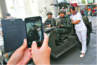 昨日,一名泰國媒體記者對新京報記者表示,軍車上街后,一些泰國民眾反而表現得歡欣鼓舞。