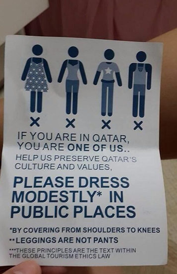 傳單上解釋稱,“如果你身處卡塔爾,你就是我們的一員。請幫助維護卡塔爾的文化和價值觀。請在公眾場合穿著得體。”