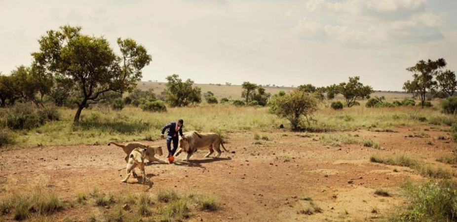 非洲管理員與獅子踢足球呼吁保護動物