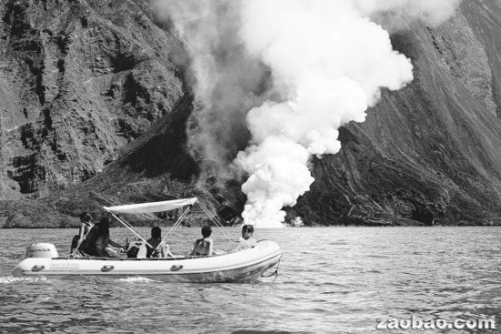當地時間9日,滾燙的熔巖從火山口流入海里,海上冒起了濃濃白煙。