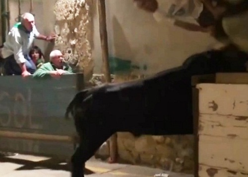 51歲男子布里塞安最為大膽,他為挑釁公牛,向公牛投擲水杯。結(jié)果布里塞安的行為引來公牛注意,公牛將他逼到墻角,狠狠撞倒并拋起他。