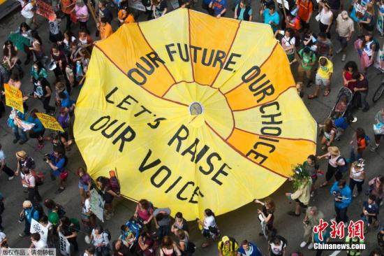 當地時間9月21日,數以萬計民眾在紐約展開大游行,呼吁應對氣候變化。此次大游行是為9月23日召開的聯合國氣候變化峰會而舉辦的,獲得了聯合國和紐約市政府的支持,是史上最大規模的應對氣候變化游行之一。聯合國秘書長潘基文、紐約市長白思豪、法國外長法比尤斯、美國前副總統戈爾、著名動物學家珍妮·古道爾、萊昂納多·迪卡普里奧等眾多國際名流參加游行。