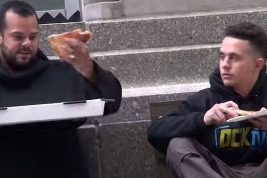 幾分鐘后,當“饑餓路人”走過來,要求分享他的比薩餅時,這名流浪漢毫不猶豫地撕下一片,送給他吃。