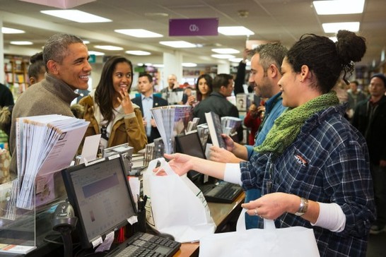 奧巴馬響應“星期六小商家日”(Small BusinessSaturday),前往獨立書店“政治學與散文”(Politics and Prose)購書。