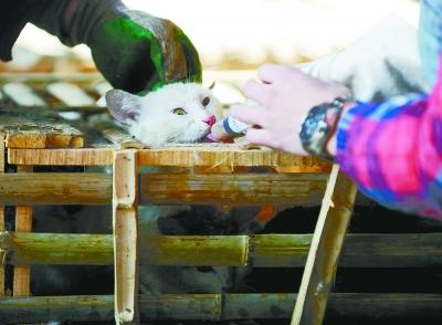 志愿者將帶來的貓糧用水溶化后,拿著注射器給竹籠里的貓一只只注食,底層竹籠里貓全部被糞水淋濕,志愿者將這些貓?zhí)У疥柟庀聲窀伞?/span>