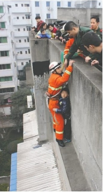 “那個小男孩站在6樓窗臺的水泥遮雨板上,兩腳已經開始發抖了。”消防隊員表示,小寶當時的情況十分危急,“我們首先擔心的就是他太害怕,或是體力不支,不小心掉下去。”經過現場合計,救援人員當即分工:由派出所民警在旁邊與男孩保持對話,安慰其靜心等待救援;同時,由一名消防戰士系上安全繩,從天臺下滑到窗臺上,將小男孩抱住,送離險境。