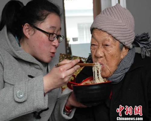 正月初一,江雨佳為70歲老人陳新順送去湯圓;正月初三,她為69歲老人林小英送去水餃;正月初四,她來到62歲老人陳夏秋家中,幫忙打掃衛(wèi)生;正月初六,她喂98歲高齡的孤寡老人林文錦吃長壽面。