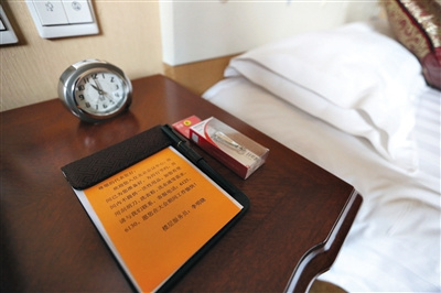 北京團(tuán)駐地北京會議中心,每名代表的房間床頭柜上,樓層服務(wù)員都留有統(tǒng)一的橘黃色便條,上邊印有“為厲行節(jié)約,房間內(nèi)不提供一次性用品。如您有使用刮胡刀、洗衣粉、洗衣液等需求,請與我們聯(lián)系”字樣。