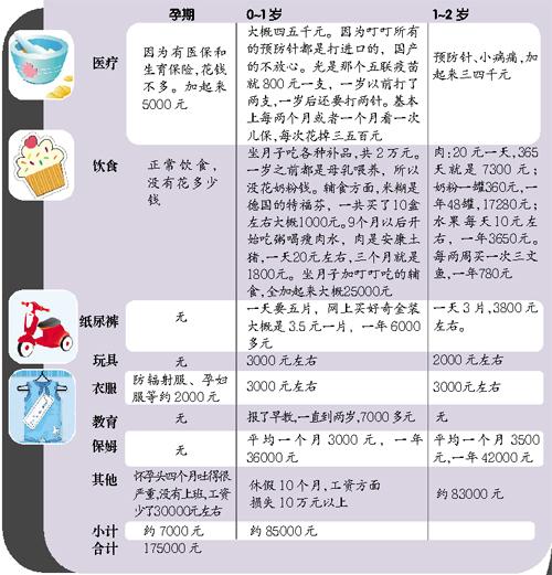 溫小姐夫婦收入還不錯,兒子快3歲了,現在主要是孩子的外婆帶。溫小姐沒有請保姆,目前每月平均在孩子身上的直接支出約1300元左右。下半年孩子上幼兒園后平均一個月超過3000元。估算后,孩子上小學前要花22.6萬元。