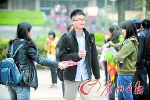 昨日,省考佛山考場外面,面試培訓(xùn)班工作人員向考生派宣傳單。 記者陳楓 攝