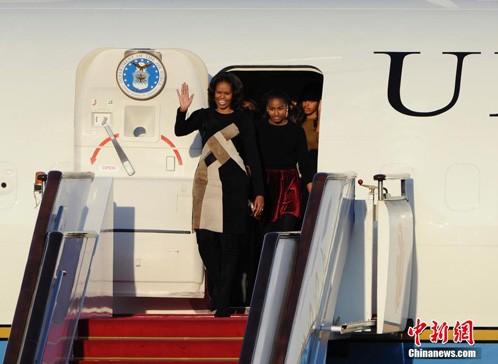 穿一身拼色連衣裙的米歇爾走出機(jī)艙,在夕陽中微笑揮手。兩個女兒瑪利亞和薩沙分別穿著酒紅色和銀白色絲絨短裙,顯得十分高挑。米歇爾的母親瑪麗安·羅賓遜著深色短裝,看上去很精神。