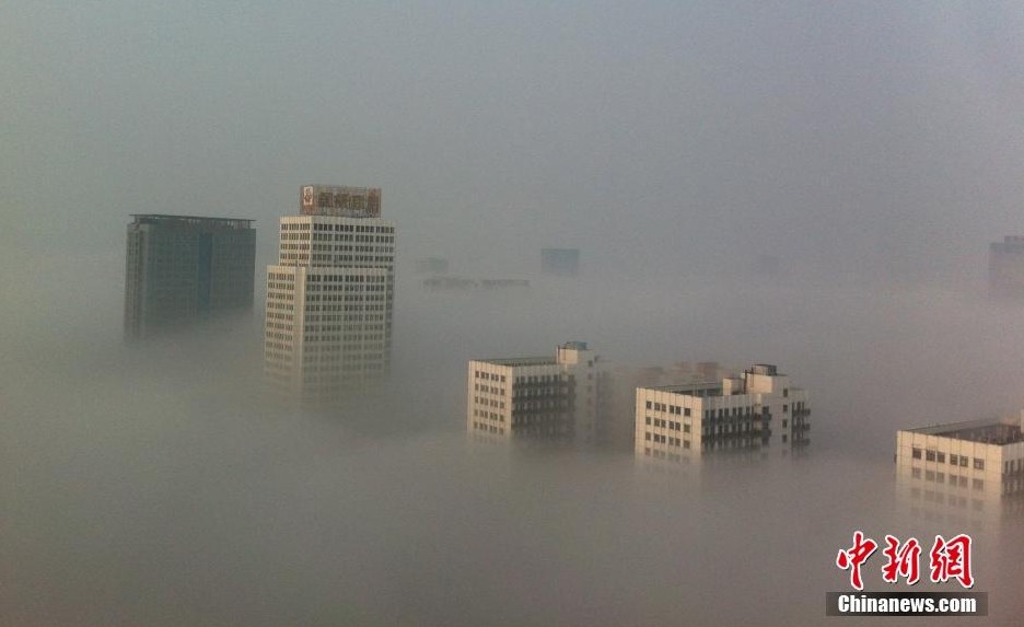 安徽合肥遭遇大霧天氣,能見度不到一百米,遠處高樓影影綽綽,