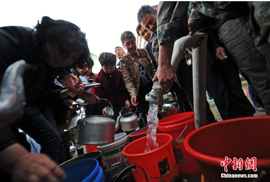 4月12日,蘭州市西固區蘭煉一中的免費供水點,市民接水。據了解,蘭州市組織消防、街道社區等多部門給蘭州市多處社區進行安全水供應24小時不間斷,直到水源安全為止。現在供應的消防車內的水來自水廠上游的深層地下水,水源無污染,可放心使用。