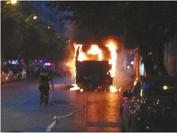 昨晚8時(shí)許,記者趕到宜賓市一醫(yī)院文星街站牌處看到,一輛公交車已被燒成了光架架,現(xiàn)場道路已經(jīng)封鎖,交通部門正在清理現(xiàn)場,預(yù)計(jì)晚9時(shí)將該車挪走,恢復(fù)交通。
