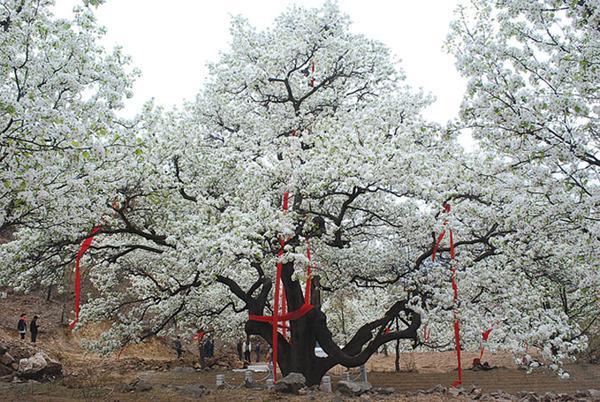 500歲梨王開花,多根紅綢加身,鮮花壓滿枝頭。