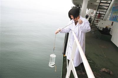 17日,曹妃甸港,工作人員正在對海水進行取樣。