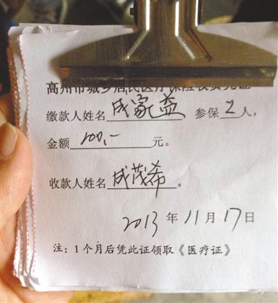 他找出幾張大田村民上繳高州市城鄉(xiāng)居民醫(yī)療保險的單據(jù),每張單子下面都有“成茂希”三個字,字跡工整、一筆一畫,而對比整改通知書上的“成茂希”三字,字跡則是連筆,并且有些潦草。為此,他質(zhì)疑通知書上有可能不是父親的簽名。