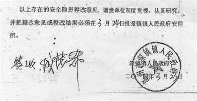 昨日,成茂希的兒子對新京報記者稱,5日他在網(wǎng)上看到這份《安全生產(chǎn)隱患整改通知書》的復印件,他表示從沒聽父親說簽收過這個通知書,他感覺簽名不像父親的筆跡。