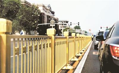 昨天,北京青年報記者在長安街沿線看到,金黃色的新護欄,干凈亮麗,莊嚴大氣。護欄上鑲嵌的蓮花圖案也更加凸顯了祥瑞之氣。“蓮花雖然是護欄的裝飾物,但也是專門設計專門制作的,安裝的位置要讓人從側面看和從上面看都很舒服,開車經過時感覺蓮花瓣是立體的。” 護欄的生產廠家北重集團相關負責人介紹。