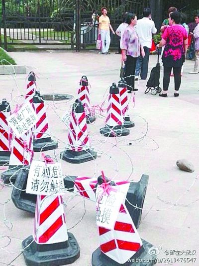 昨天,網(wǎng)友“@留在大武漢”發(fā)布微博稱,為了阻止廣場舞,漢陽一小區(qū)外出現(xiàn)了大量鐵絲網(wǎng)。但沒過多久“陣地”就已經(jīng)被“攻陷”。
