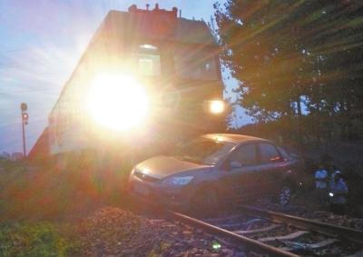 現場:火車把轎車頂出30多米遠