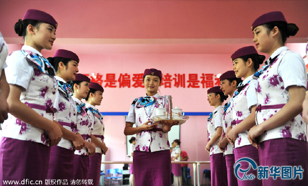 2014年6月18日,重慶客運段做好開行動車組列車準備工作,從全段普車列車長、動車列車員中選取35名優秀人才進行動車列車長的專業培訓,圖為重慶客運段動車組列車乘務員正在進行禮儀訓練。