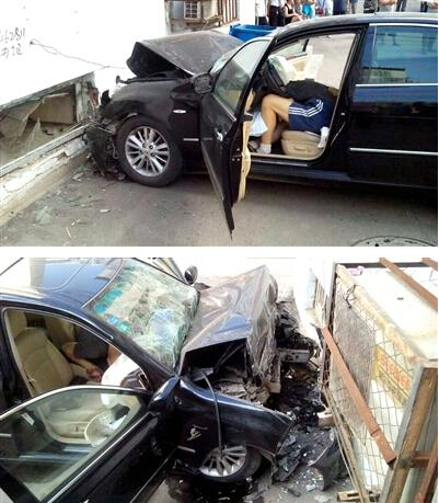 16時30分,記者趕到事發現場看到,轎車撞到一樓半地下室的窗戶周圍的墻上,兩塊玻璃被撞碎,轎車前燈和碎玻璃散落在地下室內的地面上。轎車內一名身著白色T恤的男子趴在車內方向盤上,額頭和身上全是血,車內兩個氣囊彈出。車體前部完全變形,引擎蓋凸起,地上散落著車體碎片。事故發生時地下室內沒人。