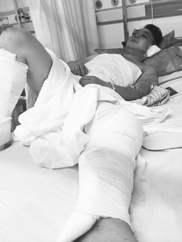 昨日上午,在海南醫(yī)學院附屬醫(yī)院住院部,左橙躺在床上,他的一只耳朵被刀砍傷,全身多處刀傷,雙腿以及手上、背上全用紗布纏了起來。據(jù)悉,當天的手術搶救持續(xù)了五個小時。