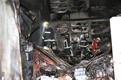 昨天晚上9點(diǎn),在事發(fā)倉(cāng)庫(kù)附近,空氣中彌漫一股燒焦的味道,消防員正在清理現(xiàn)場(chǎng)。現(xiàn)場(chǎng)幾根五六米高的橋墩被藍(lán)色鐵皮包裹著,已不見明火,仍可看到里面被燒焦的飲料、牛奶包裝。