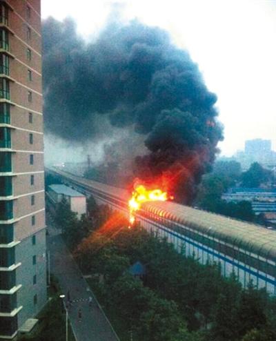 圖片中可看到,13號(hào)線一段地鐵高架橋上有明火。