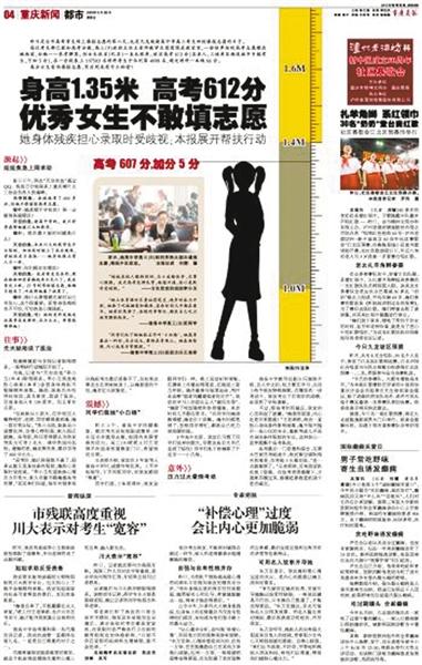 盡管這個(gè)分?jǐn)?shù)令家人很是驕傲,但李密先后填的兩所一本高校都以“身體條件不行”退回了她的檔案,最終,她被二本院校重慶交通大學(xué)化工專業(yè)錄取。