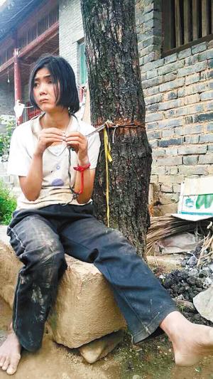 昨天,記者在洛南縣城關鎮窄口村村民老張家時,看到院里一個二十多歲的女孩正獨自坐在門前杏樹下的一塊大石頭上,她光著腳丫、眼神呆滯、頭發凌亂,左手的手腕被一根拼接的布繩綁住,繩子的另一頭綁在樹干上,對于陌生人的靠近也毫無反應。從樹上拴著鐵鏈的痕跡和樹下石頭的光滑程度來看,張艷榮被拴在樹上不是一天兩天的事了,究竟是誰將她拴在這里?正在記者詫異時,在地里干活的老張夫婦匆匆趕過來說:被拴在樹上的女娃是自己的女兒,將孩子綁在樹上,也是家里的無奈之舉。