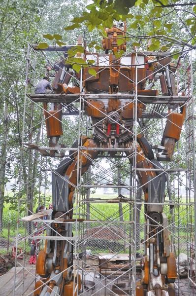 “‘擎天柱’高度是10米、重量有9噸多,用了1600多個零件焊接而成。”變形金剛的制造者、岳寨村村民岳二兵向記者介紹他的“寶貝”時,臉上帶著自豪的笑容。