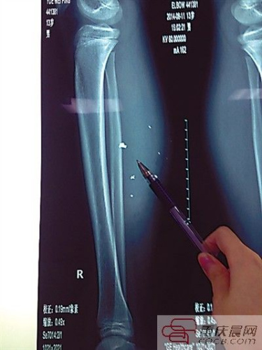 第二天,傷勢過重的平平轉院至兒童醫院,骨科醫生周悅航說,經檢查,平平右小腿腫脹明顯,發現有爆炸傷伴異物殘留,后側可見兩處1厘米裂口,傷口較深,約1.5-2厘米。通過X光片可見患兒右小腿皮下多處高密度影,即手機爆炸后進入小腿的異物,大約10處,需通過手術取出。