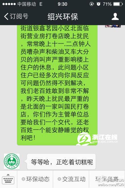昨天上午,網友“紹興F520”向紹興環保局官方微信投訴噪音擾民,沒料到環保局秒回說:等等哈,正吃著切糕呢!這讓“紹興F520”哭笑不得,政府官方微信怎么會有這么不靠譜的回復?