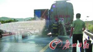 救援人員抵達現場發(fā)現,泄漏油罐車裝有30噸柴油,因追尾導致油罐車罐體尾部裂開,柴油大量泄漏。中隊指揮員立即組織人員對泄漏的柴油進行稀釋,并做好現場警戒。汕尾消防支隊其后增派救援人員連同一輛水罐車到達現場,同時倒灌車也到達現場,準備實施倒灌。汕尾消防支隊負責人現場決定用毛巾和木質屑實施堵漏。