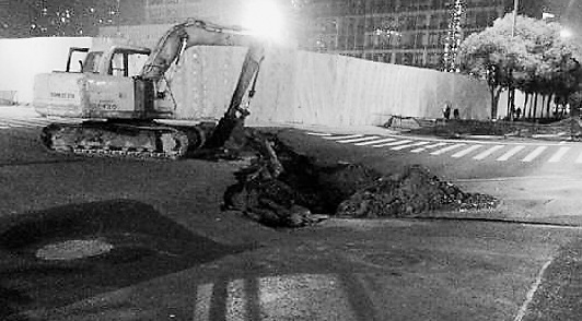 前天晚上,在杭州錢江新城的富春路與城星路口西北角,路面上又一次出現了一個大坑。