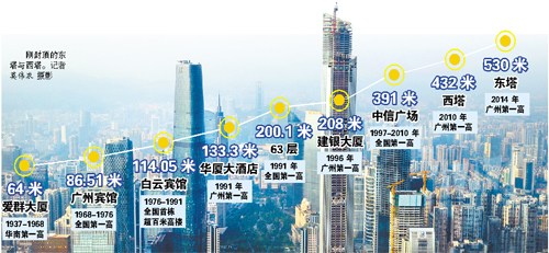 隨著珠江新城CBD的建設,廣州的摩天大樓全面開啟了300米以上時代。2014年10月28日,高達530米的東塔正式封頂,取代西塔成為廣州第一高樓。目前,僅珠江新城范圍內建成或封頂的300米以上建筑就有7座,在建的2座,規劃和預備階段的多座。 文/ 記者廖靖文