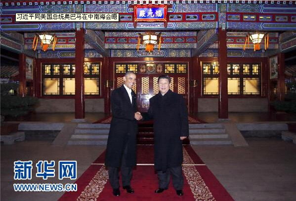 11月11日晚,國家主席習(xí)近平在中南海同美國總統(tǒng)奧巴馬舉行會(huì)晤。這是兩國元首在瀛臺(tái)涵元殿前握手。 新華社記者 鞠鵬 攝