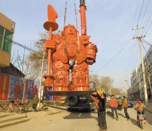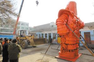 23日夜,大型運輸車將拉它們到唐山崔景哲美術館。據了解,這兩尊《武士》裝置藝術品,在業界獨一無二。 □文/記者 謝鑫名 圖/記者 張海強