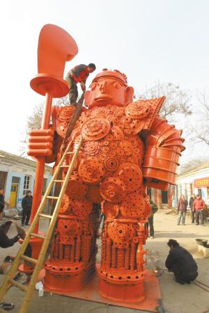 這兩個“大個頭”緣何如此惹眼?單從數據上看,它們高6.5米,寬3米左右,每尊武士10噸,稱得上“高大”;從結構和材料上看,它們是中國武士的造型,炫眼;顏色是傳統的中國紅,耀眼;而組裝它們的是廢鋼爛鐵,燙眼。