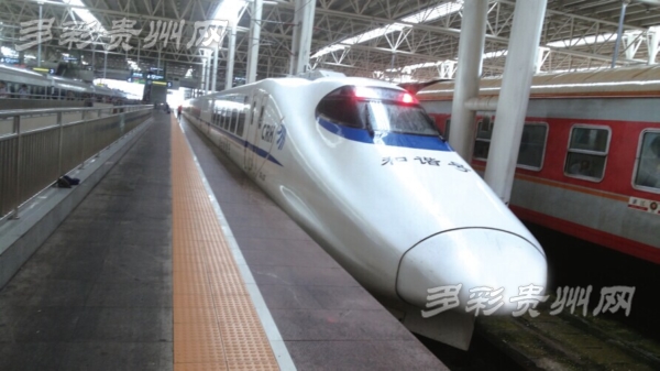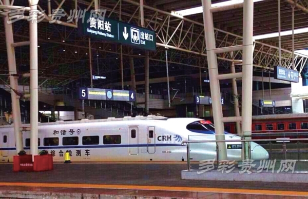 昨日上午,記者在貴陽火車站看見了用于貴廣高鐵聯(lián)調(diào)聯(lián)試的綜合檢測車,一共有8節(jié)車廂,由一等座及二等座車廂組成,前后均掛著“和諧”號機(jī)車,有的車廂里面有許多設(shè)備儀器,工作人員在對車上設(shè)備進(jìn)行調(diào)試。站臺上,一些工作人員得知這是高鐵動車檢測車后,拿出手機(jī)及相機(jī)拍照。“這個就是動車,我還是第一次看見高鐵動車。”一名旅客說道。“快了,我們貴州也有高鐵了,而且是西南真正意義上的第一條高鐵,以后去廣州就方便了。”貴陽至北京西T150次列車一名列車員興奮地說道。