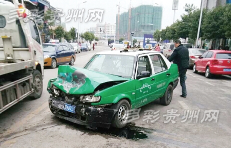 昨天上午9點過,記者趕到了世紀城合肥路龍凱苑大門,只見一輛綠色出租車車頭被撞得嚴重變形,漏了一地機油。