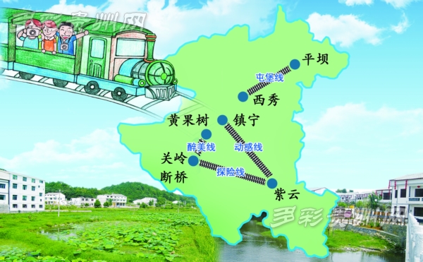 安順市旅游小火車規劃初步方案建設時間從2014到2030年,整個線路全長設計大概有200多公里,分屯堡線(平壩到西秀區段);動感線(鎮寧到紫云段);醉美線(鎮寧黃果樹段到關嶺斷橋段);探險線(關嶺到紫云段)。(杜興旭)